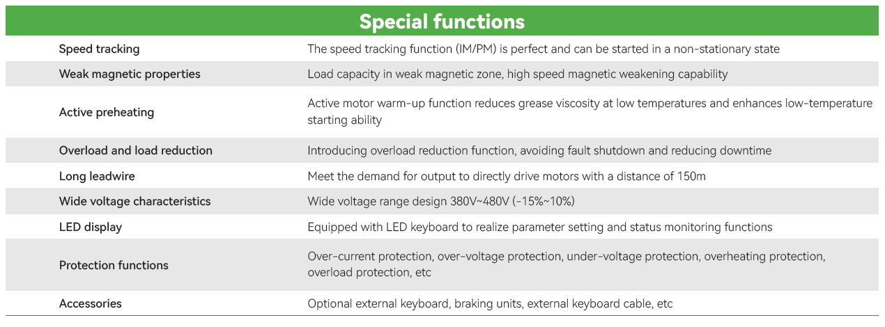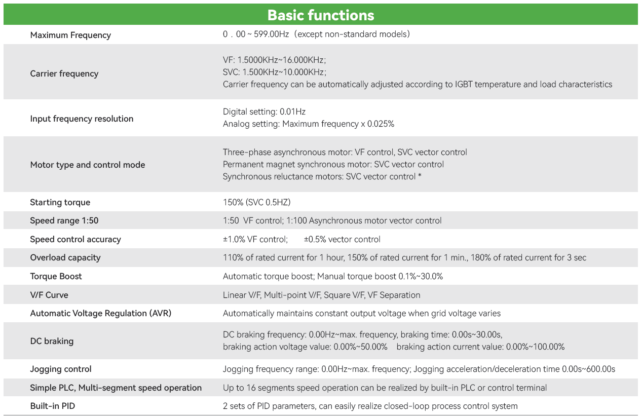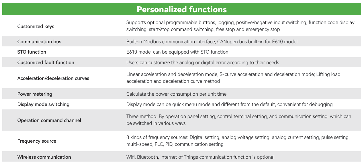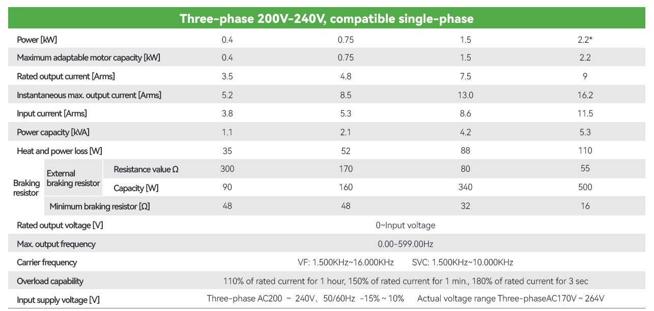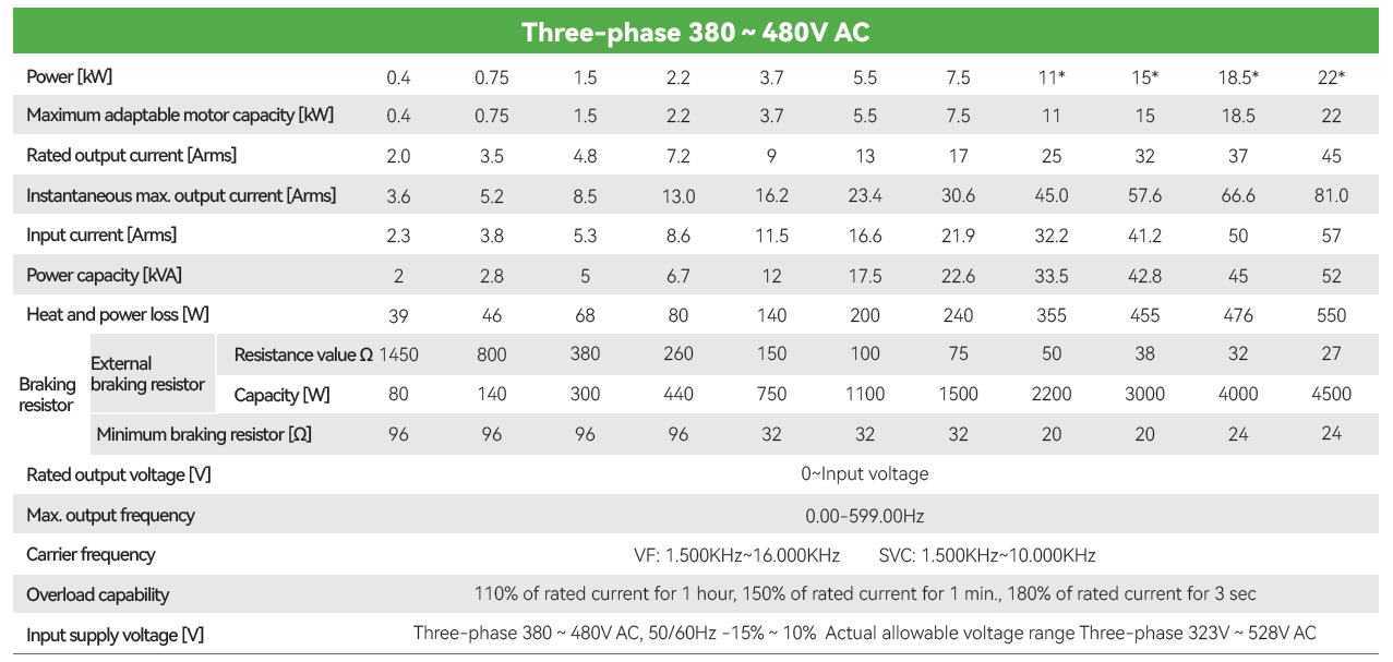 • Rango de Potencias: 0.4KW-2.2KW(Trifásica 220V), 0.4KW-22KW(Trifásica 380V)