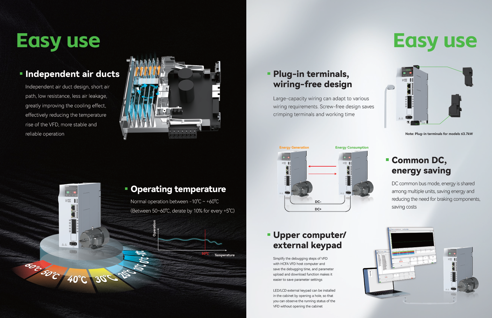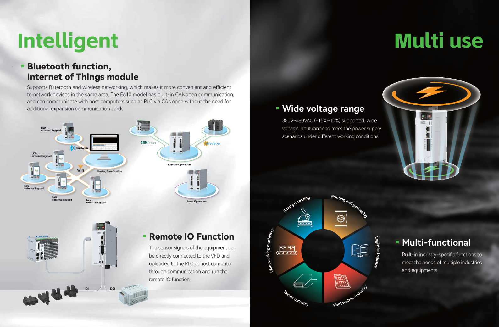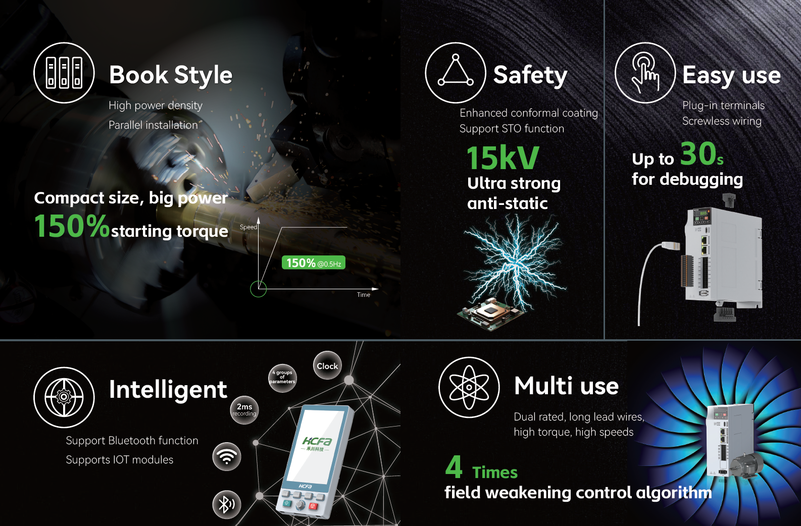 • Rango de Potencias: 0.4KW-2.2KW(Trifásica 220V), 0.4KW-22KW(Trifásica 380V)