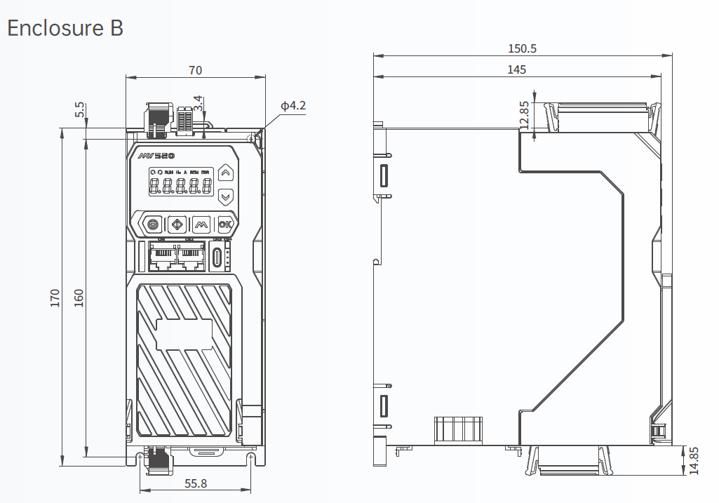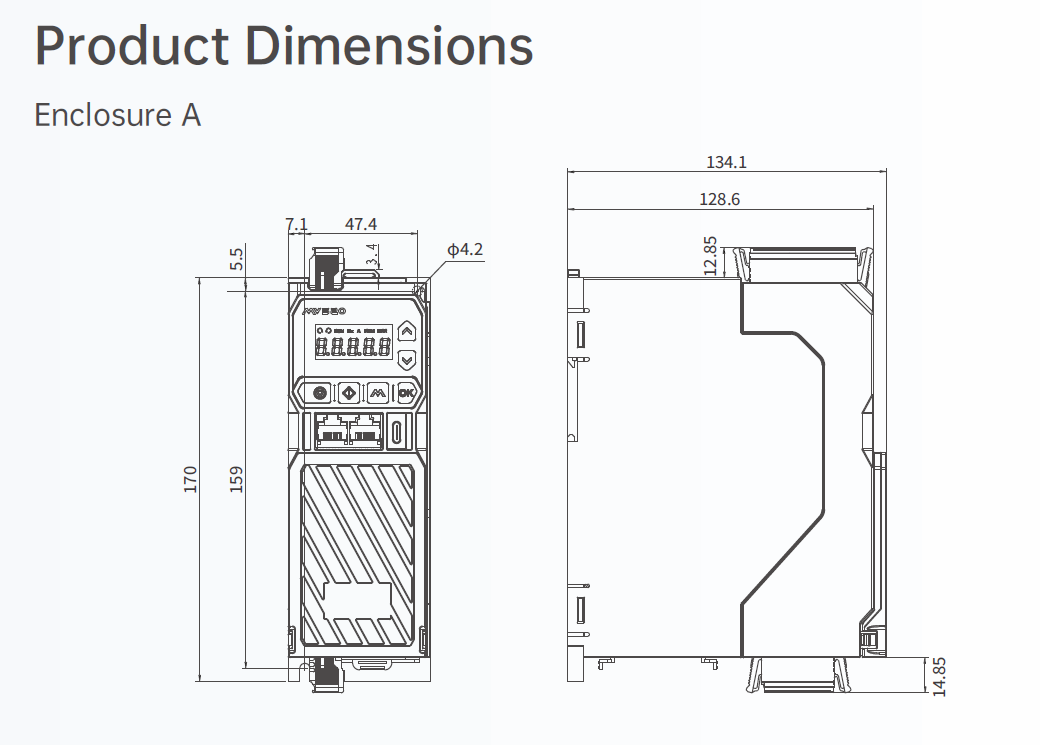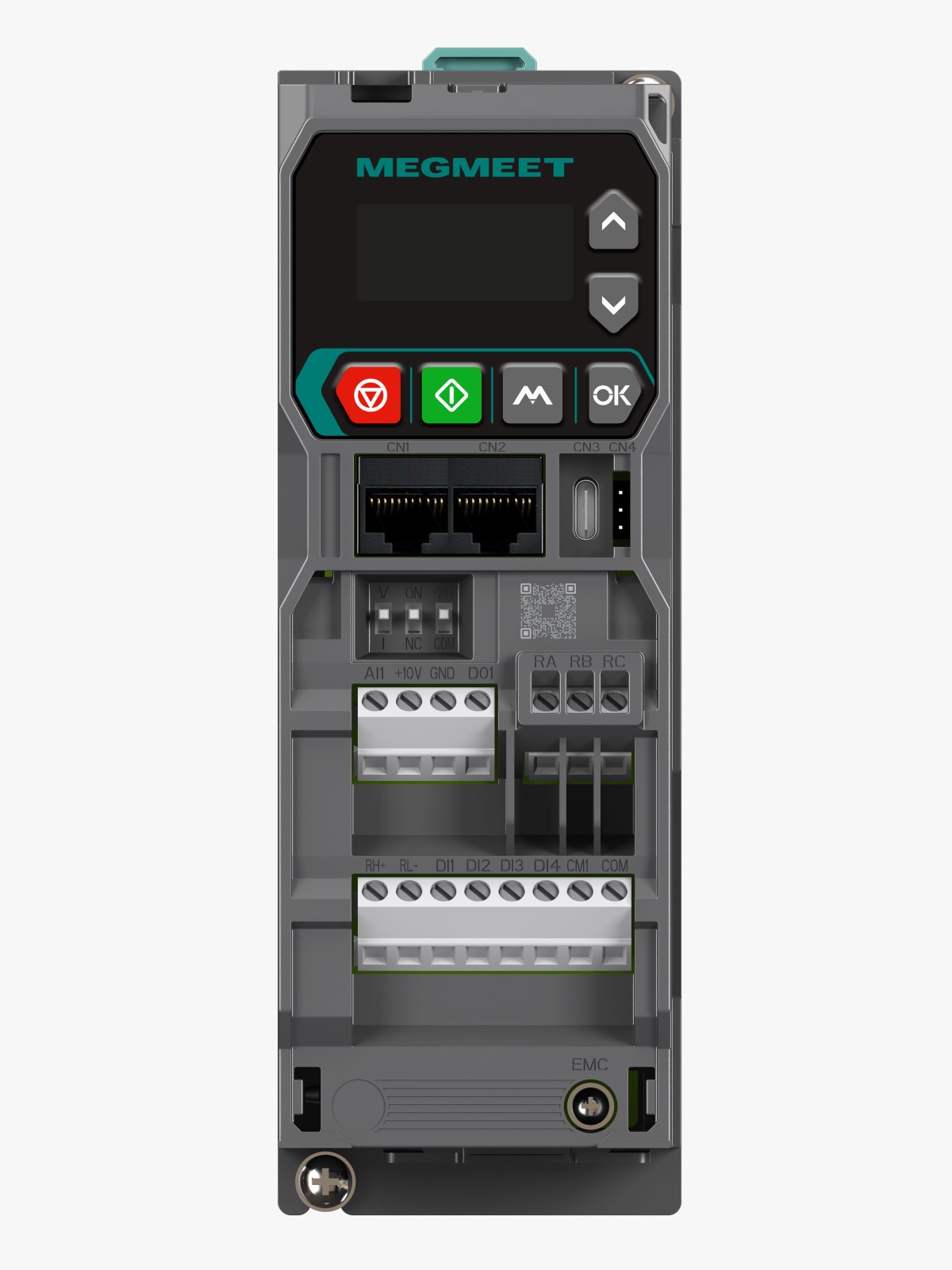 Dos puertos RJ45 para conexión en red de múltiples unidades, teclado remoto y RS485/CANopen