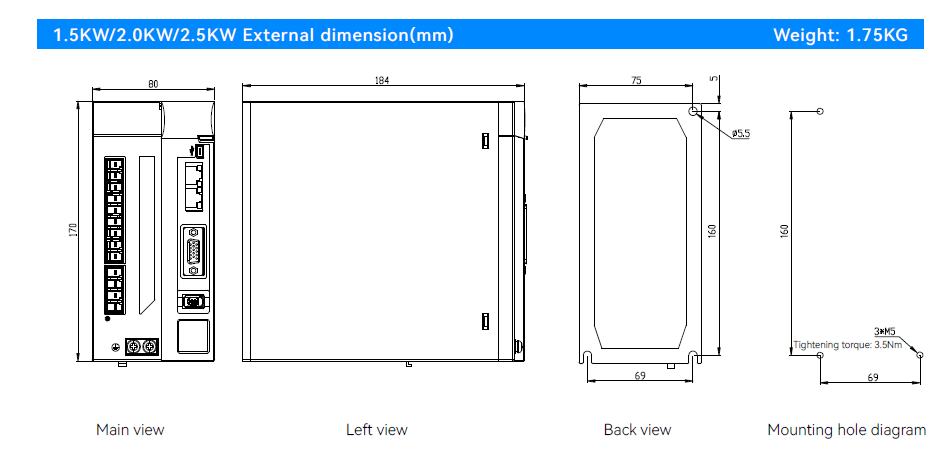 - 220V: 1.5KW-2.5KW, Alimentación AC Trifásica 220V